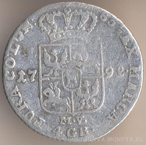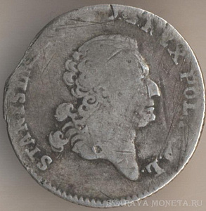 25 ноября 1764 года королём Польши стал бывший сердечный друг Екатерины II Великой Станислав Август Понятовский, главными достоинствами которого было то, что он отличался привлекательной внешностью и красноречием. Взойдя на престол, он проявил себя разумным правителем: реформировал армию, закупил новое оружие. Также он учредил орден Святого Станислава, который впоследствии войдёт в число наград Российской Империи. 10 февраля 1766 года была проведена денежная реформа, в результате которой Польша перешла на кёльнскую монетную стопу. Отныне при производстве монет бралась за основу кёльнская марка, равная 233,855 грамма «чистого» серебра – из одной марки полагалось чеканить строго определённое число монет того или иного достоинства. Одна марка делилась на 10 конвенционных талеров; в свою очередь, 1 конвенционный талер соответствовал 8 злотым – данный курс просуществовал до 1787 года, когда на фоне утраты ряда территорий и экономических неурядиц его пришлось корректировать. Курс злотого, ставшего официальной валютой, отныне был таков: 4 серебряных или 30 медных грошей. Из обращения наконец-то изымаются боратинки времён Яна II Казимира, причём, не просто изымаются, а выкупаются по курсу 75% от их номинальной стоимости. Несколько позднее (в 1776 году) были изъяты и тымфы. Теперь перечислим монеты, чеканившиеся при короле Станиславе Августе Понятовском (1764-1795): солид (медь, масса - 1,3 грамма), полугрош (медь, масса - 1,9 грамма), грош (медь, масса - 3,89 грамма), трояк или 3 гроша (медь, масса - 11,5 грамма), грошен или 1/24 талера, или 7-1/2 гроша (серебро 367-й пробы, масса - 1,99 грамма), 2 грошена или 1/12 талера, или 15 грошей (серебро 587-й пробы, масса - 3,34 грамма), шостак (биллон, масса - 1,6 грамма. Чеканился в 1794-95 годах), 10 грошей (серебро 373-й пробы, масса - 2,49 грамма. Чеканились с 1787 года), злотый или 4 грошена (серебро 550-й пробы, масса – 5,31 грамма), двойной злотый или 8 грошенов (серебро 626,7-й пробы, масса – 9,35 грамма), полуталер (серебро 833-й пробы, масса – 14,03 грамма), 6 злотых (серебро, масса – 24 грамма), талер (серебро 833-й пробы, масса – 28,07 грамма). Из золота чеканились: дукат (986-я проба, масса - 3,5 грамма), полтора дуката (986-я пробы, масса – 5,25 грамма), 3 дуката (986-я пробы, масса – 10,5 грамма).