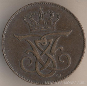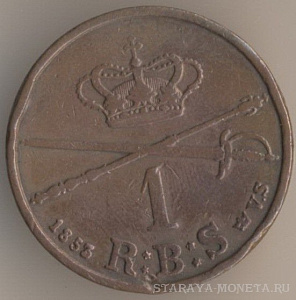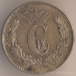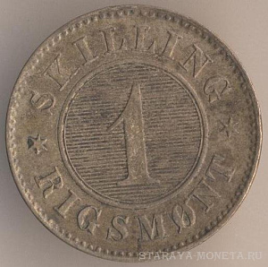 1 скиллинг ригсмёнт 1867 года, бронза, диаметр - 21 мм, толщина - 1,6 мм, тираж неизвестен. Чеканились в 1867 и 1869-72 годах. Соответствовали 1/96 ригсдалера. Находились в обращении до образования Скандинавского валютного союза между Данией и Швецией.