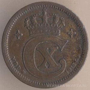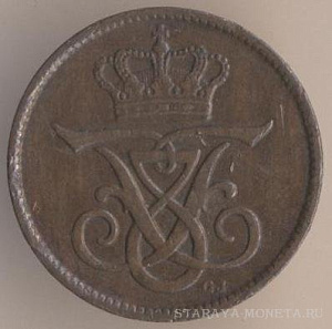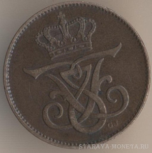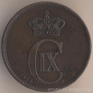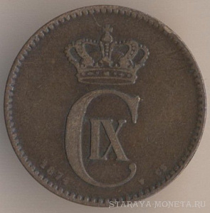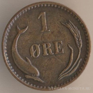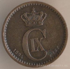 Кристиан IX (1863-1906). 1 эре 1894 года, бронза, масса - 2 грамма, диаметр - 16 мм, толщина - 1,3 мм, тираж - 4982000 экземпляров. Минцмейстер Вильгельм Бурхард Поулсен. Чеканились в 1874-76, 1878-83, 1886-89, 1891-92, 1894, 1897, 1899, 1902 и 1904 годах. В обращении до 31 марта 1973 года.