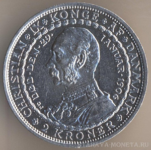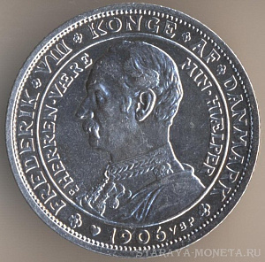 2 кроны 1906 года, серебро 800-й пробы, масса - 15 граммов, диаметр - 31 мм, тираж - 151000 экземпляров. Гравёр: Кнуд Гуннар Йенсен. "На смерть короля Кристиана IX и восшествие на престол короля Фредерика VIII". Единственный выпуск.
