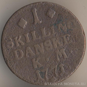 Кристиан VII (1766-1808). 1 скиллинг, медь. Чеканились в 1771-1785 годах с датой "1771". Чеканились в Копенгагене, Альтоне и Конгберге. Вес и размер этих монет варьирует от 8,83 до 14,1 грамма и 27,05-31,45 мм, соответственно.