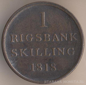 1 ригсбанкскиллинг (1/96 ригсбанкдалера) 1818 года, медь, масса - 7,31 грамма, диаметр - 23 мм, толщина - 2 мм, тираж не известен. Единственный выпуск.