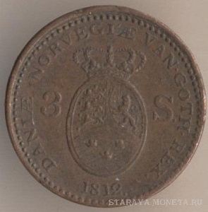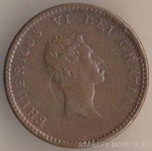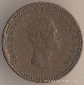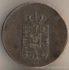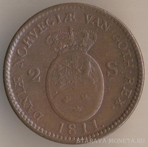 Фредерик VI (1808-1839). 2 скиллинга 1811 года, медь, масса - 4,85 грамма, диаметр - 21,5 мм, толщина - 2 мм, тираж неизвестен. Чеканились в 1810-11 годах.
