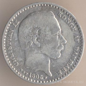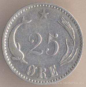 25 эре 1905 года, серебро 600-й пробы, масса - 2,42 грамма, диаметр - 17 мм, толщина - 1,15 мм, тираж - 1722000 экземпляров. Минцмейстер - Вильгельм Бухард Поулсен. Чеканились в 1874, 1891, 1894, 1900 и 1904-1905 годах. В обращении до 30 сентября 2008 года.