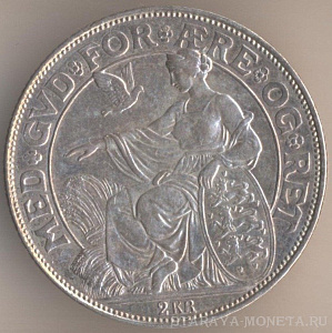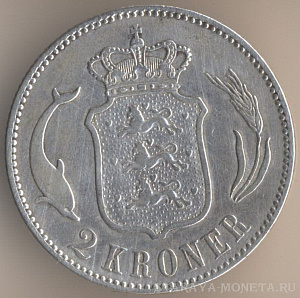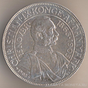 2 кроны 1903 года, серебро 800-й пробы, масса - 15 граммов, диаметр - 31 мм, тираж - 103000 экземпляров. Гравёр: Кнуд Гуннар Йенсен. "Сорокалетие правления короля Кристиана IX". Единственный выпуск.