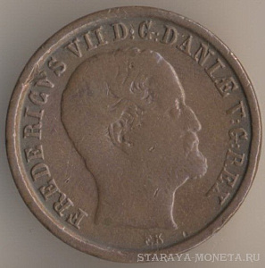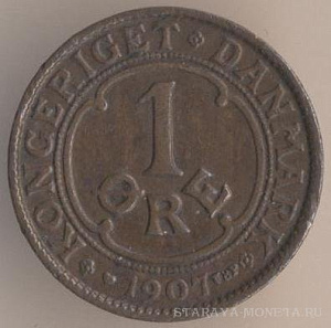 Фредерик VIII (1906-1912). 1 эре 1907 года, бронза, масса - 2 грамма, диаметр - 16 мм, толщина - 1,4 мм, тираж - 5975000 экземпляров. Гравёр: Кнуд Гуннар Йенсен. Чеканились в 1907, 1909, 1910 и 1912 годах. В обращении до 31 марта 1973 года.