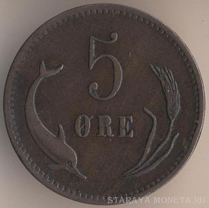 5 эре 1874 года, бронза, масса - 8 граммов, диаметр - 27 мм, толщина - 1,7 мм, тираж - 2762000 экземпляров. Минцмейстер: Дидерик Кристиан Андреас Сведенсен. Годы чеканки: 1874-75, 1882, 1884, 1890-91, 1894, 1898-99, 1902, 1904 и 1906. В обращении до 30 июня 1989 года.