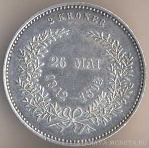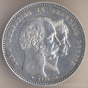 2 кроны 1892 года, серебро 800-й пробы, масса - 15 граммов, диаметр - 31 мм, тираж - 101000 экземпляров. Гравёр: Харальд Конрадсен. "Золотая свадьба короля Кристиана IX и королевы Луизы". Единственный выпуск.