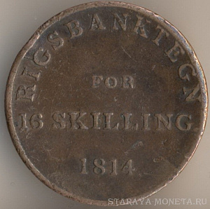 В 1813-15 годах в ходе подготовки к денежной реформе были выпущены токены номиналом 2, 3, 4, 6, 12 и 16 скиллингов. 16 скиллингов 1814 года, медь, масса - 14,12 грамма, диаметр - 30 мм, толщина - 3 мм, тираж неизвестен. Единственный выпуск.