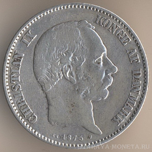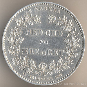 2 кроны 1875 года, серебро 800-й пробы, масса - 15 граммов, диаметр - 31 мм, толщина - 2,22 мм, тираж - 3396000 экземпляров. Гравёр: Харальд Конрадсен. Чеканились в 1875, 1876, 1878, 1897 и 1899 годах.