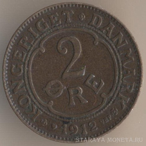 2 эре 1912 года, бронза, масса - 4 грамма, диаметр - 21 мм, тираж - 2480000 экземпляров. Гравёр: Кнуд Гуннар Йенсен. Чеканились в 1907, 1909 и 1912 годах. В обращении до 31 марта 1973 года.