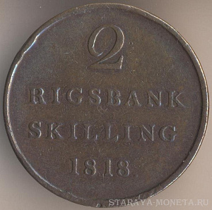 2 ригсбанкскиллинга (1/48 ригсбанкдалера) 1818 года, медь, масса - 14,616 грамма, диаметр - 31 мм, толщина - 3 мм, тираж неизвестен. Единственный выпуск.