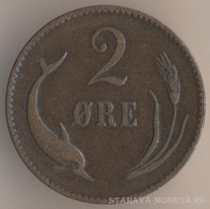 2 эре 1874 года, бронза, масса - 4 грамма, диаметр - 21 мм, толщина - 1,5 мм, тираж - 8828000 экземпляров. Минцмейстер Дидерик Кристиан Андреас Сведенсен. Чеканились в 1874-76, 1880-81, 1883, 1886-87, 1889, 1891-92, 1894, 1897, 1899, 1902 и 1906 годах. В обращении до 31 марта 1973 года.