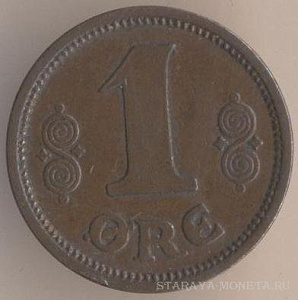 Кристиан Х (1912-1947). 1 эре 1913 года, бронза, масса - 2 грамма, диаметр - 16 мм, тираж - 5011000 экземпляров. Гравёр: Кнуд Гуннар Йенсен. Чеканились в 1913, 1915-17 и 1919-23 годах. В обращении до 31 марта 1973 года.