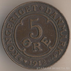5 эре 1912 года, бронза, масса - 8 граммов, диаметр - 27 мм, тираж - 999000 экземпляров. Гравёр: Кнуд Гуннар Йенсен. Чеканились в 1907, 1908 и 1912 годах. В обращении до 30 июня 1989 года.
