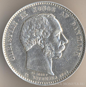 2 кроны 1888 года, серебро 800-й пробы, масса - 15 граммов, диаметр - 31 мм, тираж - 101000 экземпляров. Гравёр: Харальд Конрадсен. "Двадцатипятилетие правления короля Кристиана IX". Единственный выпуск.