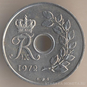 25 эре 1972 года, медно-никелевый сплав, масса - 4,23 грамма, диаметр - 22,97 мм, толщина - 1,49 мм, тираж - 31422002 экземпляра. Гравёр: Харальд Саломон. Чеканились в 1966-72 годах. В обращении до 30 сентября 2008 года.