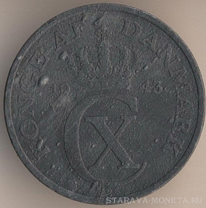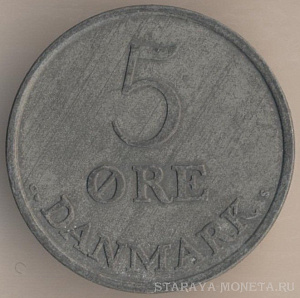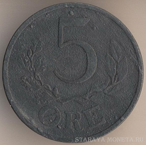 Германская оккупация (1940-1945). 5 эре 1943 года, цинк, масса - 6,4 грамма, диаметр - 27 мм, тираж - 4522000 экземпляров. Гравёр: Харальд Саломон. Чеканились в 1942-45 годах. В обращении до 31 марта 1973 года.