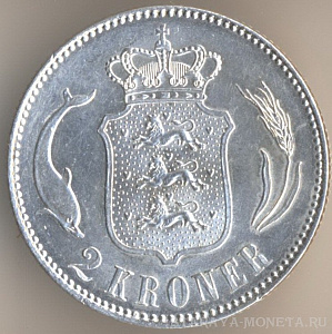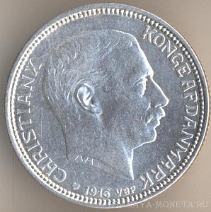 2 кроны 1916 года, серебро 800-й пробы, масса - 15 граммов, диаметр - 31 мм, тираж - 402000 экземпляров. Минцмейстер Андреас Фредерик Вильгельм Хансен. Монеты данного дизайна чеканились в 1915-16 годах.