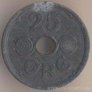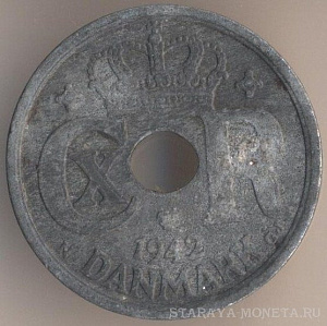 Германская оккупация (1940-1945). 25 эре 1942 года, цинк, масса - 3,6 грамма, диаметр - 23 мм, толщина - 1,64 мм, тираж - 997000 экземпляров. Гравёр: Кнуд Гуннар Йенсен. Чеканились в 1941-45 годах. В обращении до 30 сентября 2008 года.