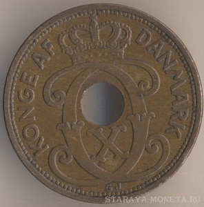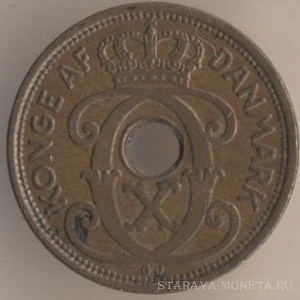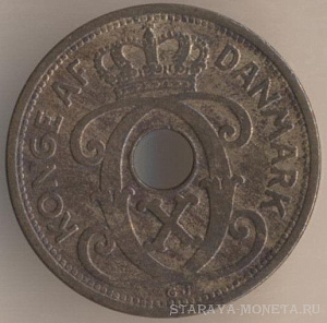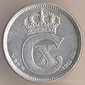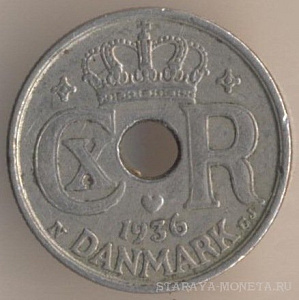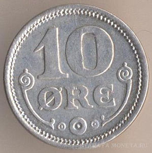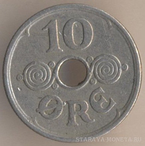 10 эре 1936 года, серебро 400-й пробы, масса - 1,45 грамма, диаметр - 15 мм, тираж - 5042000. Гравёр: Кнуд Гуннар Йенсен. Чеканились в 1914-19 годах. В обращении до 30 июня 1989 года.