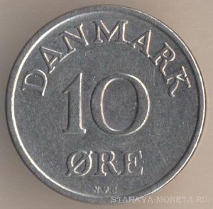 10 эре 1971 года, медно-никелевый сплав, масса - 3 грамма, диаметр - 18 мм, толщина - 1,52 мм, тираж - 17719247 экземпляров. Гравёр: Харальд Саломон. Чеканились в 1960-72 годах. В обращении до 30 июня 1989 года.