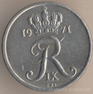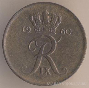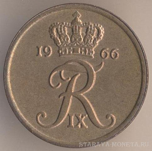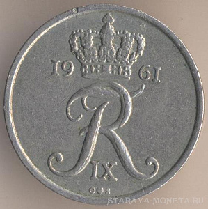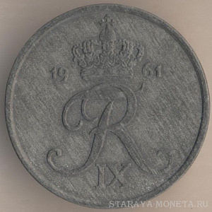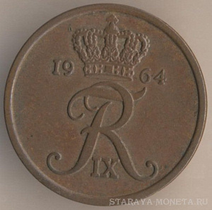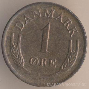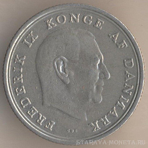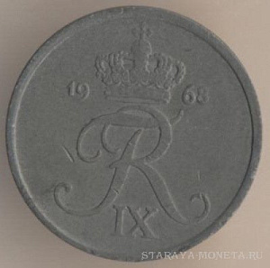 Фредерик IX. 1 эре 1968 года, цинк, масса - 1,6 грамма, диаметр - 16 мм, толщина - 1,25 мм, тираж - 21889113 экземпляров. Гравёр: Харальд Саломон. Чеканились в 1948-55 (монограммы N/S) и в 1956-72 годах (монограммы C/S). В обращении до 31 марта 1973 года.