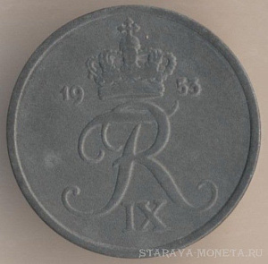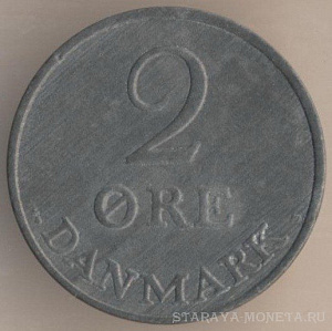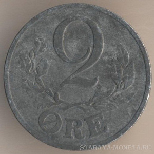 2 эре 1953 года, цинк, масса - 3,2 грамма, диаметр - 20,8 мм, толщина - 1,66 мм, тираж - 8112191 экземпляр. Гравёр: Харальд Саломон. Чеканились в 1948-55 годах (монограммы N/S). В обращении до 31 марта 1973 года. Монограмма N принадлежит минцмейстеру (директору Копенгагенского монетного двора) Нильсу Петеру Нильсену.