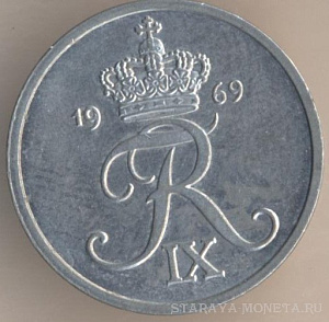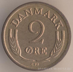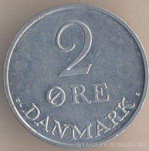 2 эре 1969 года, цинк, масса - 3,2 грамма, диаметр - 20,8 мм, толщина - 1,66 мм, тираж - 8112191 экземпляр. Гравёр: Харальд Саломон. Чеканились в 1956-72 годах (монограммы С/S). В обращении до 31 марта 1973 года. Монограмма С принадлежит минцмейстеру (директору Копенгагенского монетного двора) Альфреду Фредерику Кристиансену.