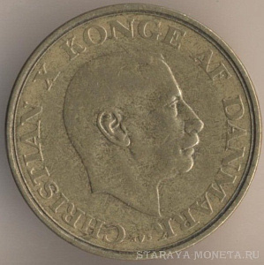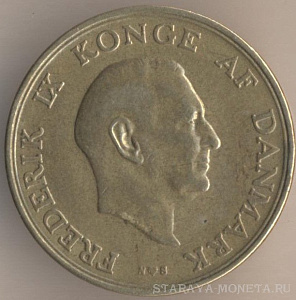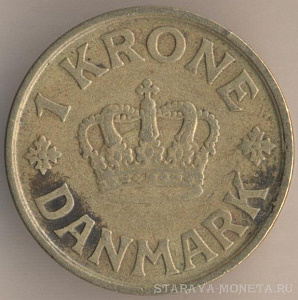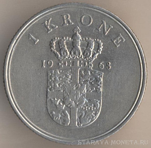 1 крона 1968 года, медно-никелевый сплав, масса - 6,5 грамма, диаметр - 25,5 мм, толщина - 1,8 мм, тираж - 8212999 экземпляров. Гравёр: Харальд Саломон. Чеканились в 1960-72 годах.