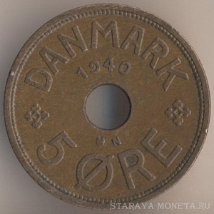 5 эре 1940 года, бронза, масса - 7,6 грамма, диаметр - 27,4 мм, толщина - 1,8 мм, тираж - 2735000 экземпляров. Гравёр: Кнуд Гуннар Йенсен. В 1926 году были изготовлены несколько пробных экземпляров с монограммами HCN/GJ, относятся к числу уникальных монет (последний известный уход через аукцион дал цену в 8600 долларов). В 1927 году был осуществлён регулярный выпуск с монограммами HCN/GJ - это стандартные и недорогие монеты. Также, в 1927-30, 1932 и 1934-40 годах чеканились монеты с монограммами N/GJ, причём, выпуск 1927 года является наиболее ценным из них. Следует упомянуть и о выпуске 1932 года в состоянии proof. Монеты находились в обращении до 30 июня 1989 года.