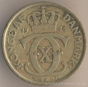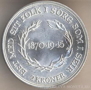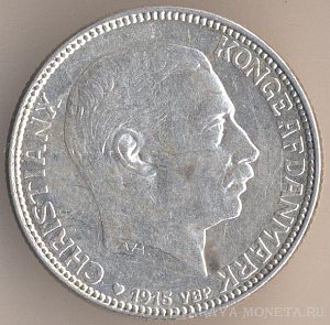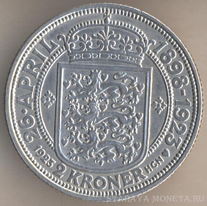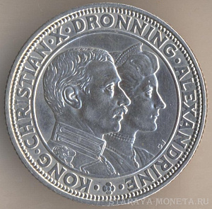 2 кроны 1923 года, серебро 800-й пробы, масса - 15 граммов, диаметр - 31 мм, толщина - 2,36 мм, тираж - 203000 экземпляров. Гравёр: Кнуд Гуннар Йенсен. "Серебряная свадьба короля Кристиана Х и королевы Александрины". Единственный выпуск.