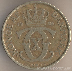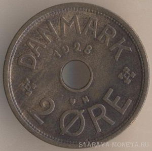 2 эре 1928 года, бронза, масса - 3,8 грамма, диаметр - 21 мм, толщина - 1,55 мм, тираж - 5758000 экземпляров. Гравёр: Кнуд Гуннар Йенсен. Чеканились в 1926-27 (с монограммами HCN/GJ) и в 1927-32 и 1934-40 годах (с монограммами N/GJ). Инициалы N принадлежат минцмейстеру (директору Копенгагенского монетного двора Нильсу Петеру Нильсену). В обращении до 31 марта 1973 года.