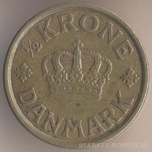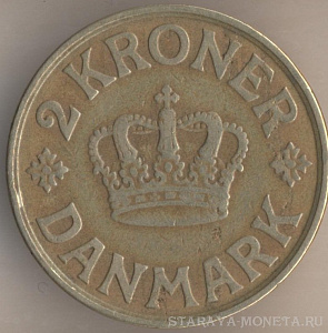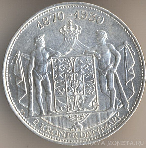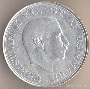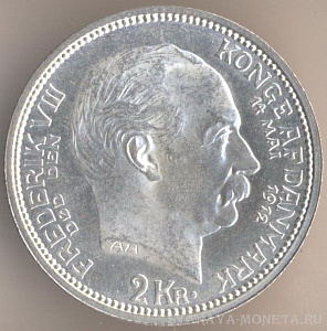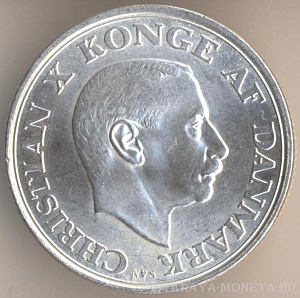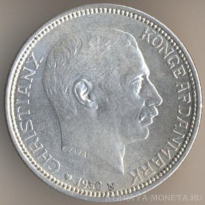 2 кроны 1930 года, серебро 800-й пробы, масса - 15 граммов, диаметр - 31 мм, толщина - 2,4 мм, тираж - 303000 экземпляров. Гравёр: Андреас Фредерик Вильгельм Хансен. "Шестидесятилетний юбилей короля Кристиана Х". Единственный выпуск.