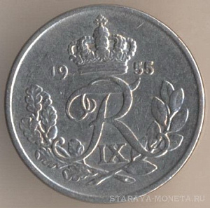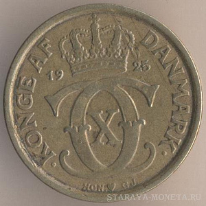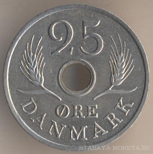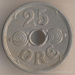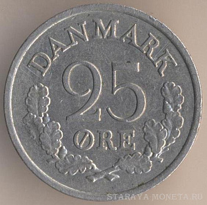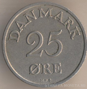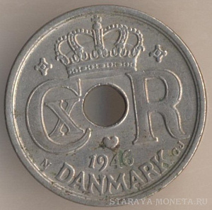 25 эре 1946 года, медно-никелевый сплав, масса - 4,5 грамма, диаметр - 23 мм, толщина - 1,5 мм, тираж - 2323000 экземпляров. Гравёр: Кнуд Гуннар Йенсен. Чеканились в двух вариантах - монограммы HCN/GJ (1924-26) и N/GJ (1929-30, 1932-40 и 1946-47). В обращении до 30 сентября 2008 года.