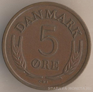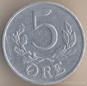 5 эре 1964 года, бронза, масса - 6 граммов, диаметр - 24 мм, толщина - 1,8 мм, тираж - 41520622 экземпляра. Гравёр: Харальд Саломон. Чеканились в 1960 и 1962-72 годах. В обращении до 30 июня 1989 года.