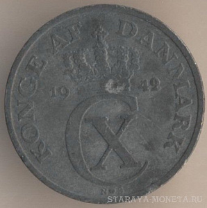 Германская оккупация (1940-1945). 2 эре 1942 года, цинк, масса - 3,2 грамма, диаметр - 21 мм, толщина - 1,25 мм, тираж - 12934000 экземпляров. Гравёр: Харальд Саломон. Чеканились в 1942-45 и 1947 годах. В обращении до 31 марта 1973 года.