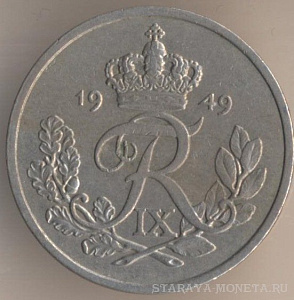 25 эре 1949 года, медно-никелевый сплав, масса - 4,5 грамма, диаметр - 23 мм, толщина - 1,48 мм, тираж - 15000165 экземпляров. Гравёр: Харальд Саломон. Чеканились в 1948-55 (монограммы N/S) и 1956-60 годах (монограммы С/S). В обращении до 30 сентября 2008 года.