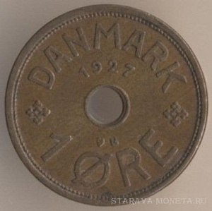 1 эре 1927 года, бронза, масса - 1,9 грамма, диаметр - 16 мм, тираж неизвестен. Гравёр: Кнуд Гуннар Йенсен. Представленный экземпляр (сочетание монограмм "N" (реверс) и "GJ" (аверс)) является самым редким для этого типа монет. Так, если для выпуска 1933 года состояние ХF оценивается по каталогу Краузе в 3,5 доллара, то для данной монеты в состоянии ХF цена составляет 25 долларов. Выпуск 1927 года был в двух вариантах: с монограммами N/GJ (редкий вариант, представленный мною) и HCN/GJ (обычный вариант, чеканившийся также и в 1926 году). В дальнейшем чеканились лишь монеты с монограммами N/GJ, но они уже не считаются редкими. Таким образом, вариант HCN/GJ был отчеканен дважды - в 1926 и 1927 годах, а N/GJ - в 1927-30, 1932-40.
