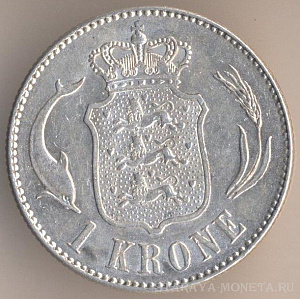 1 крона 1915 года, серебро 800-й пробы, масса - 7,5 грамма, диаметр - 25 мм, тираж - 14100000 экземпляров. Копенгагенский монетный двор. Гравёр: Андреас Фредерик Вильгельм Хансен. Чеканились в 1915 и 1916 годах.