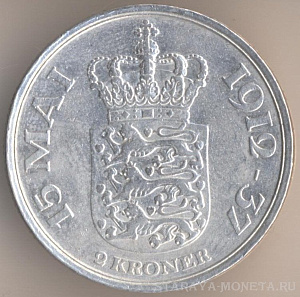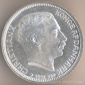 2 кроны 1912 года, серебро 800-й пробы, масса - 15 граммов, диаметр - 31 мм, тираж - 101917 экземпляров. Гравёр: Андреас Фредерик Вильгельм Хансен. "Смерть короля Фредерика VIII и восшествие на престол короля Кристиана Х". Единственный выпуск.