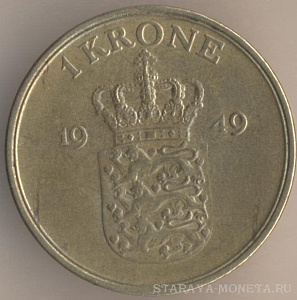 1 крона 1949 года, алюминиево-бронзовый сплав, масса - 6,5 грамма, диаметр - 25,5 мм, толщина - 1,8 мм, тираж - 1300000 экземпляров. Гравёр: Харальд Саломон. Чеканились в 1947-49, 1952-55 годах (монограммы N/S) и в 1956-60 годах (монограммы С/S).