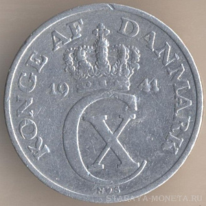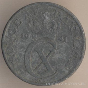Германская оккупация (1940-1945). 1 эре 1941 года, цинк, масса - 1,6 грамма, диаметр - 16 мм, толщина - 1,25 мм, тираж - 21570000 экземпляров. Гравёр: Харальд Саломон. Чеканились в 1941-46 годах. В обращении до 31 марта 1973 года.