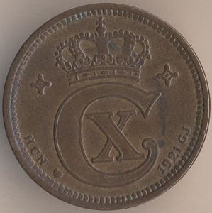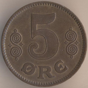 Кристиан Х (1912-1947). 5 эре 1921 года, бронза. масса - 8 граммов, диаметр - 27 мм, толщина - 1,88 мм, тираж - 3248000 экземпляров. Минцмейстер: Ханс Кристиан Нильсен. Копенгагенский монетный двор. Чеканились в 1913-14, 1916-17, 1919-21 и 1923 годах. В обращении до 30 июня 1989 года.