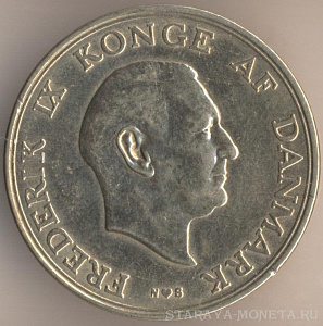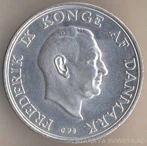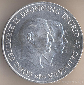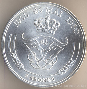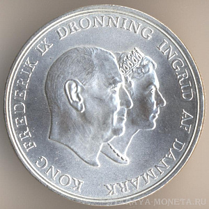 5 крон 1960 года, серебро 800-й пробы, масса - 17 граммов, диаметр - 33 мм, тираж - 410000 экземпляров. Гравёр: Харальд Саломон. "Серебряная свадьба короля Фредерика IX и королевы Ингрид". Единственный выпуск.