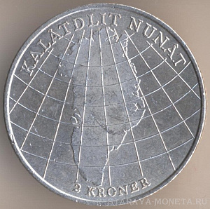 2 кроны 1953 года, серебро 800-й пробы, масса - 15 граммов, диаметр - 31 мм, тираж - 151710 экземпляров. Гравёр: Харальд Саломон. Отчеканены в честь начала противотуберкулёзной кампании в Гренландии. Единственный выпуск.