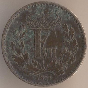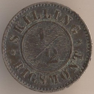 1/2 скиллинга ригсмёнт 1857 года, бронза, масса - 1,9 грамма, диаметр - 15,6 мм, тираж неизвестен. Монетный двор Альтоны. Единственный выпуск. Правление короля Фредерика VII (1848-1863).