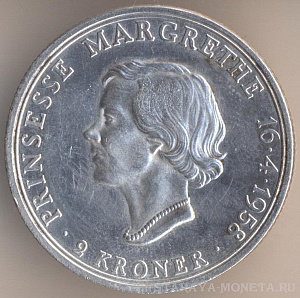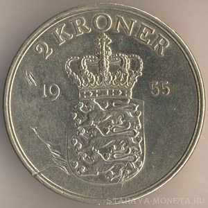 2 кроны 1955 года, алюминиево-бронзовый сплав, масса - 13 граммов, диаметр - 31,4 мм, толщина - 2,6 мм, тираж - 457000 экземпляров. Гравёр: Харальд Саломон. Чеканились в 1947-49, 1951-55 годах (монограммы N/S) и в 1956-59 годах (монограммы С/S).
