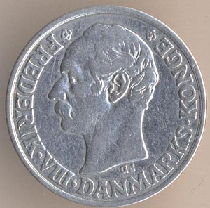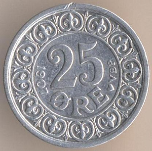 Фредерик VIII (1906-1912). 25 эре 1907 года, серебро 600-й пробы, масса - 2,42 грамма, диаметр - 17 мм, толщина - 1,3 мм, тираж - 2009000 экземпляров. Гравёр: Гуннар Йенсен. Чеканились в 1907 и 1911 годах. В обращении до 30 сентября 2008 года.
