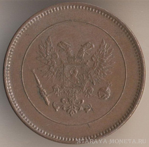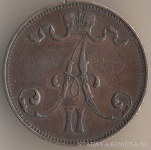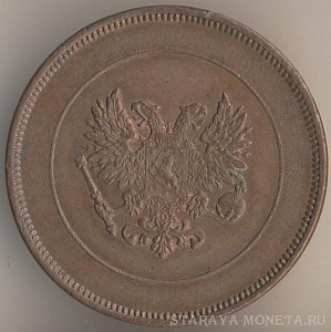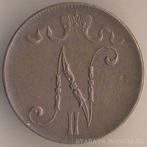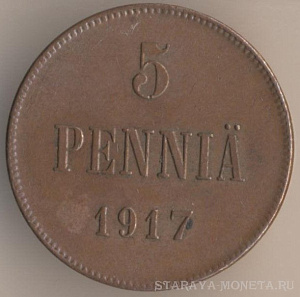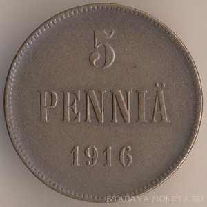 5 пенни 1916 года, медь, масса - 6,4 грамма, диаметр - 25 мм, толщина - 1,82 мм, тираж - 4470000 экземпляров. Гравёр: Александр Фадеев. Чеканились в 1896-99, 1901, 1905-1908 и 1910-17 годах. Правление императора Николая II (1894-1917).